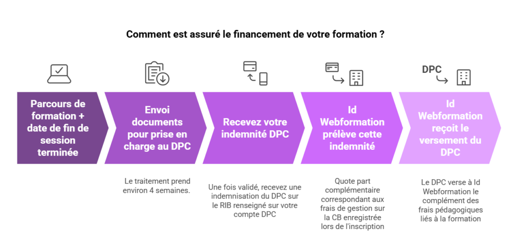 3. Id Webformation vous prélève alors sur la CB enregistrée lors de l’inscription, la quote part complémentaire correspondant aux frais de gestion. Ce montant est entièrement couvert par le versement du DPC sur votre compte bancaire. Une facture vous sera adressée par mail ainsi que votre attestation de formation.